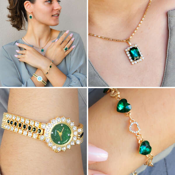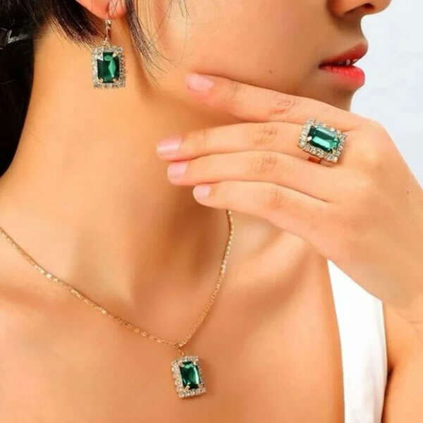 - Decorazione in zirconi e pietre: Tutti i pezzi della parure sono decorati con zirconi e pietre verdi. Le decorazioni intricate e delicate conferiscono ad ogni pezzo un tocco di lusso.